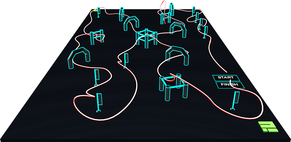 Two-person teams: one controls the drone, the second one performs the role of a mechanic in the pit stop zone. After 50 laps, they change places. Compete in passing 100 laps of the track for speed.